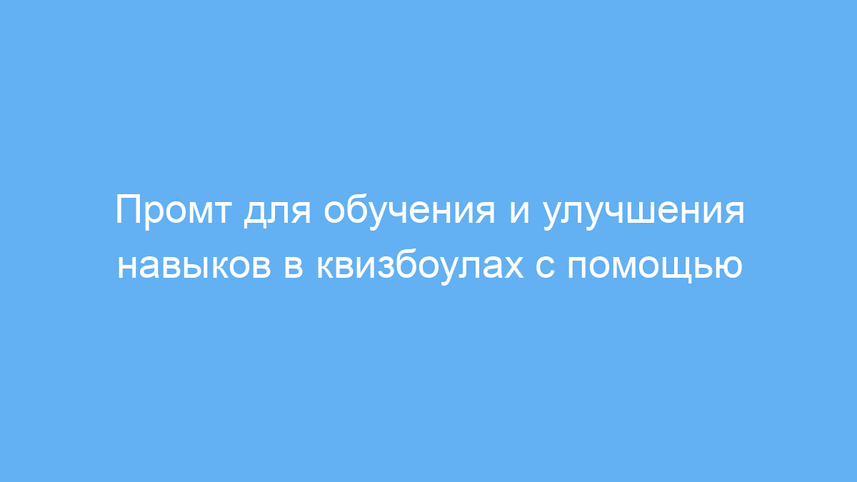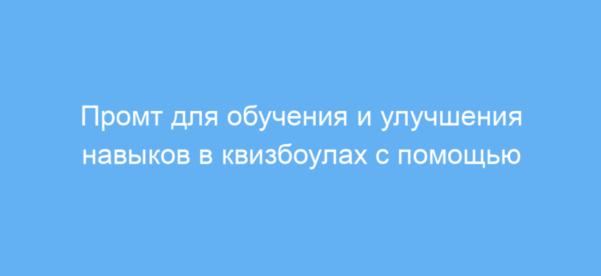 Этот промт создан для тех, кто хочет развивать свои знания и навыки участия в квизбоулах — интеллектуальных викторинах на различные темы. Он подойдет как новичкам, так и игрокам со средним и продвинутым уровнем. С помощью этого промта нейросеть становится вашим помощником и одновременно наставником, который объясняет сложные вопросы просто и понятно, учитывая ваш текущий уровень знаний.