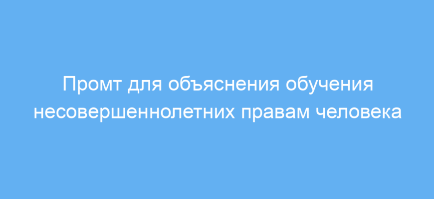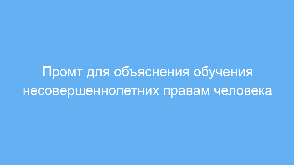 Этот промт предназначен для организаций, педагогов и активистов, которые занимаются защитой прав молодежи и хотят научить несовершеннолетних их правам человека. Он помогает создать понятное и структурированное объяснение того, как эффективнее обучать детей и подростков основам прав человека.
