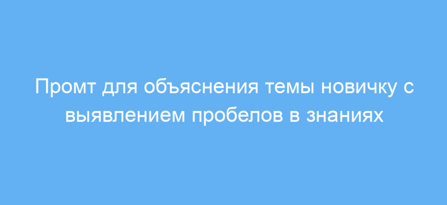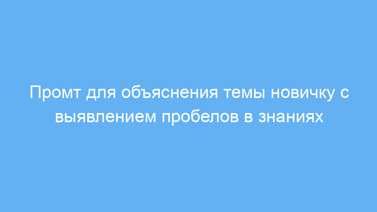 Этот промт предназначен для тех, кто хочет быстро и просто разобраться в новой теме или навыке. Он помогает объяснить сложные вещи понятным языком, словно обучая полного новичка. Также промт выявляет пробелы в знаниях пользователя и предлагает ресурсы для их заполнения.