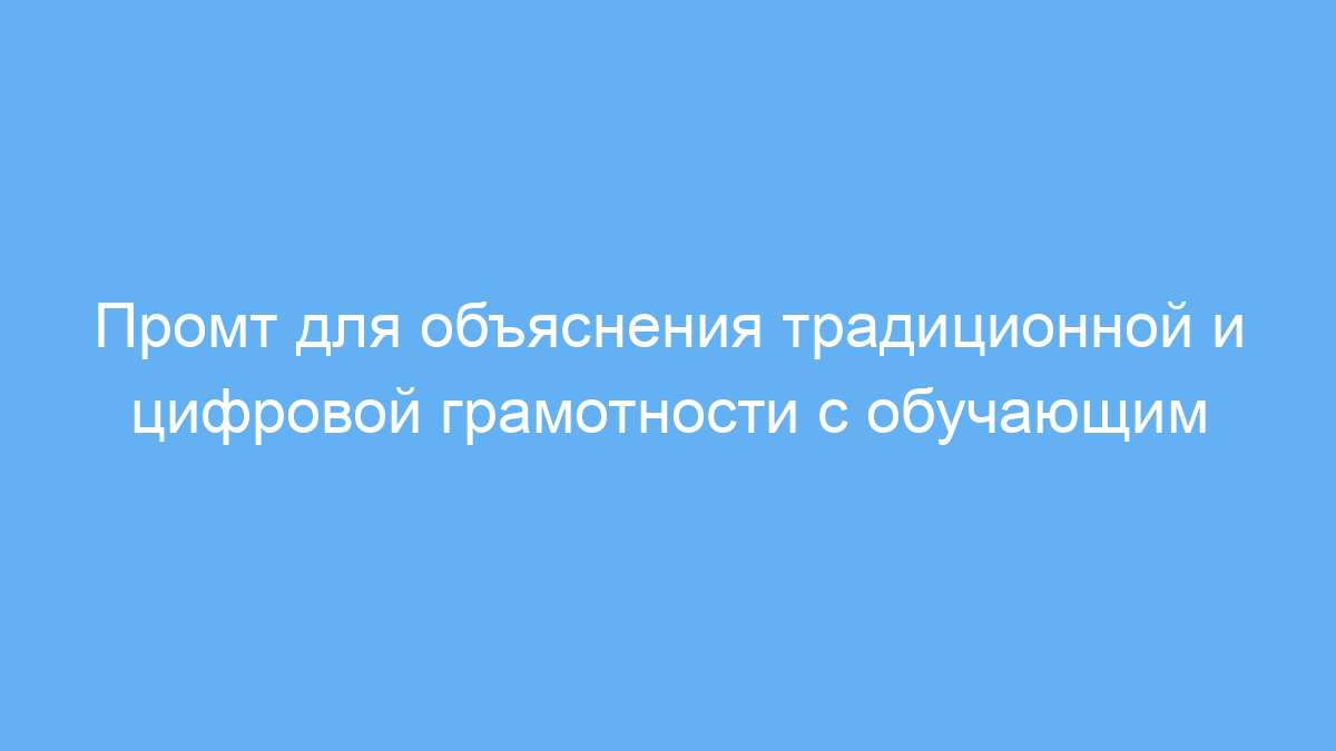 Пример 2: Тренер по цифровым навыкам для пожилых людей использует промт, чтобы доходчиво разъяснить, как развивать цифровую грамотность и в чем отличие её от традиционной, чтобы преодолеть страхи и повысить уверенность в использовании технологий.
