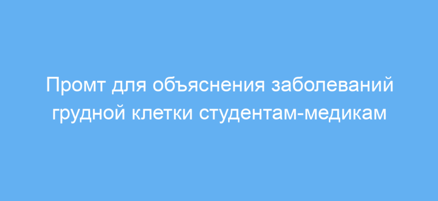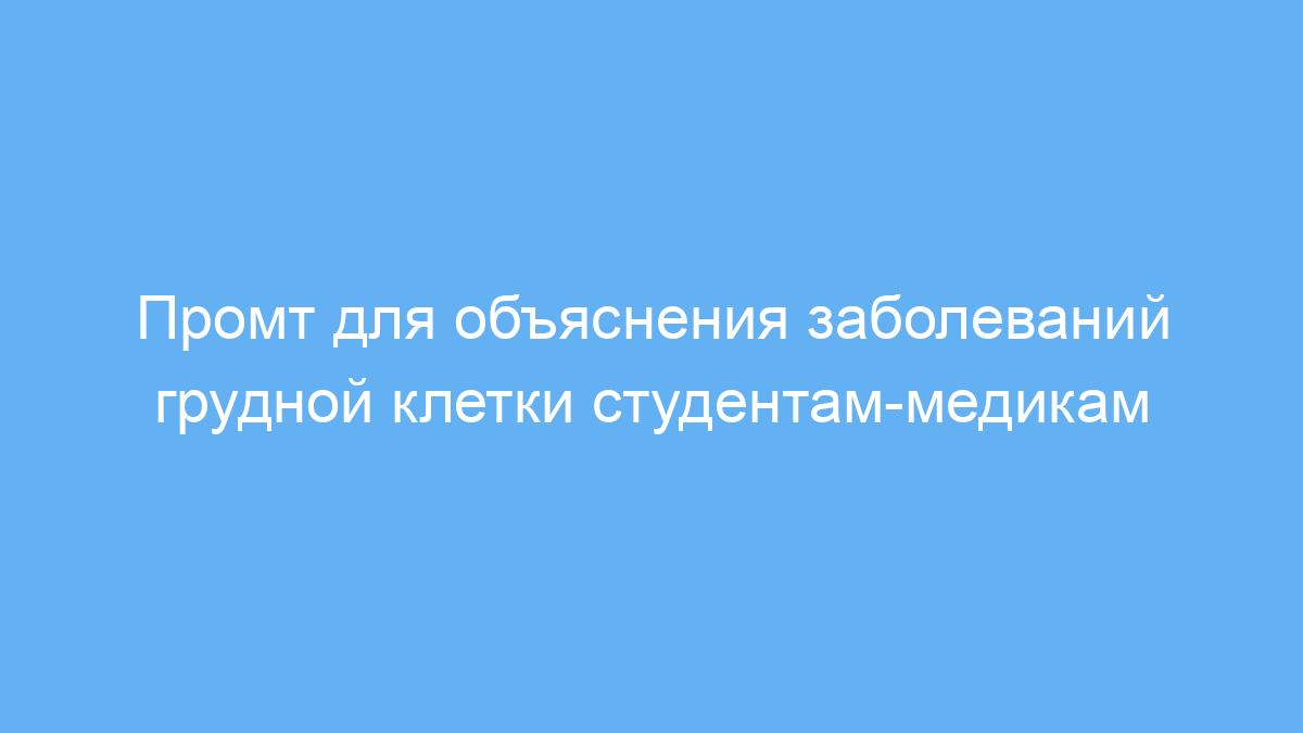 Данный промт предназначен для преподавателей и студентов медицинских специальностей, которые хотят получать доступные и понятные объяснения сложных тем о заболеваниях грудной клетки. Он помогает упростить усвоение материала за счёт использования простого языка и наглядных примеров.