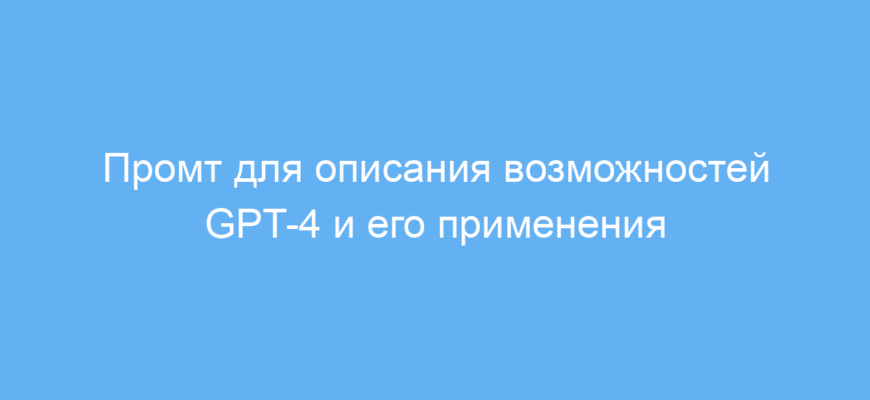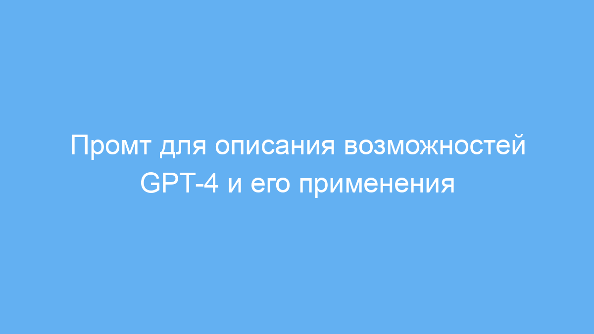- Промт подходит для получения обзоров и презентаций возможностей GPT-4, которые можно применять в обучении, работе и исследовательской деятельности.