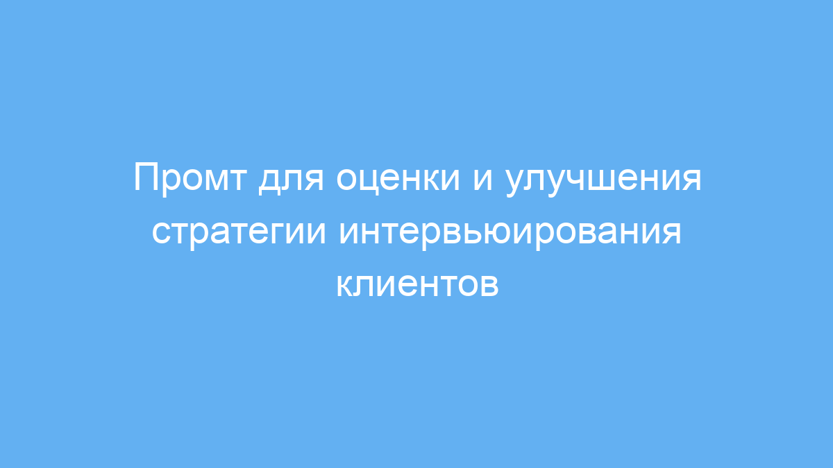 Этот промт помогает системно и объективно оценить стратегию проведения интервью с клиентами. Он выявляет ключевые недостатки и предлагает современные подходы для их устранения. Использование таких рекомендаций позволит увеличить точность анализа обратной связи и повысить эффективность развития продукта, что критично для роста и успешности стартапа.