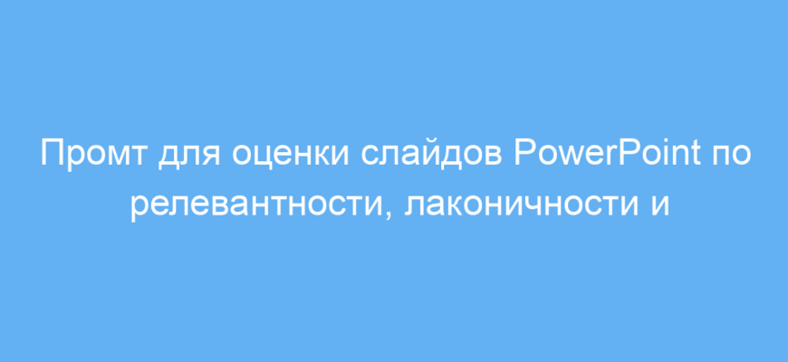 Основная задача промта — оценить каждый слайд по трем критериям: релевантность, лаконичность и орфография/грамматика. Пользователь предоставляет заголовки и тексты слайдов, а нейросеть анализирует содержимое, выставляя баллы от 1 до 10 по каждому критерию. Так можно легко понять, какие слайды требуют доработки.
