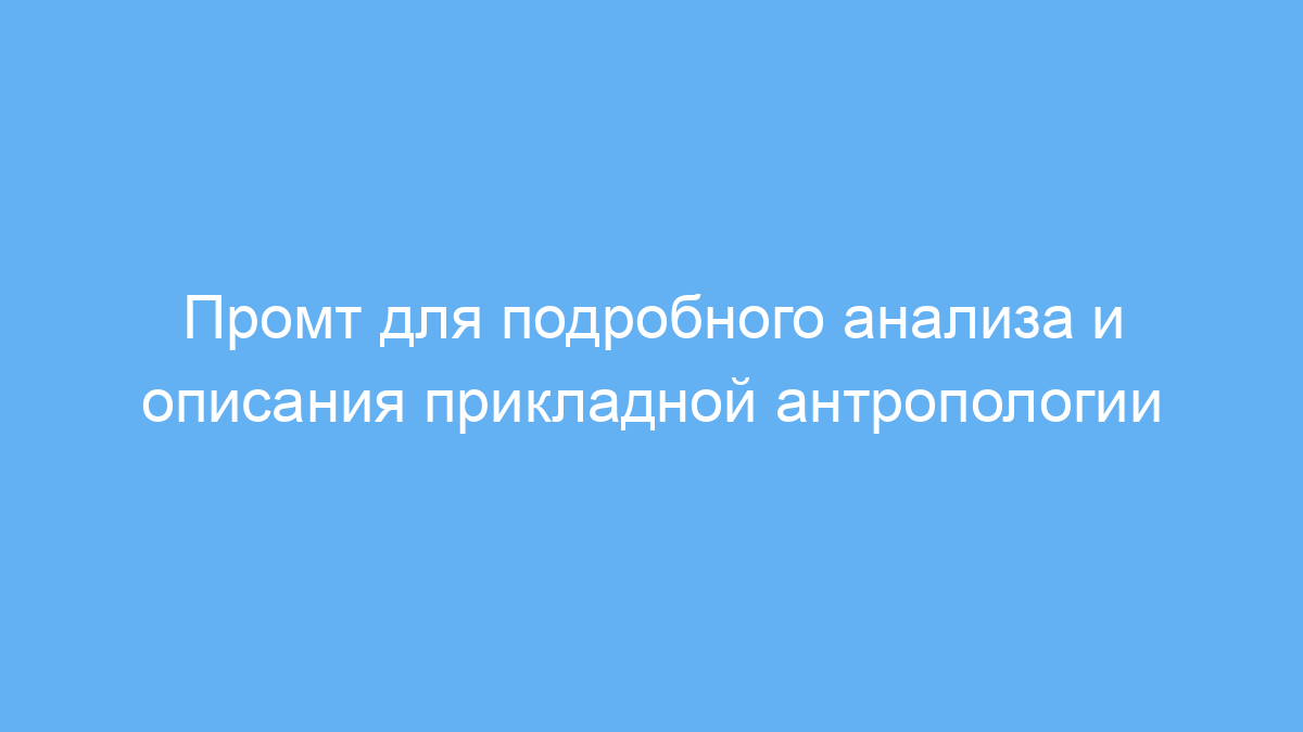 Этот промт предназначен для специалистов и студентов в области антропологии, а также для копирайтеров и исследователей, которым необходимо получить развернутое и структурированное описание прикладной антропологии на любом языке. Он помогает быстро сформулировать комплексные ответы на ключевые вопросы о прикладной антропологии, включая примеры проектов и этические аспекты.