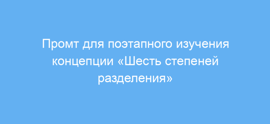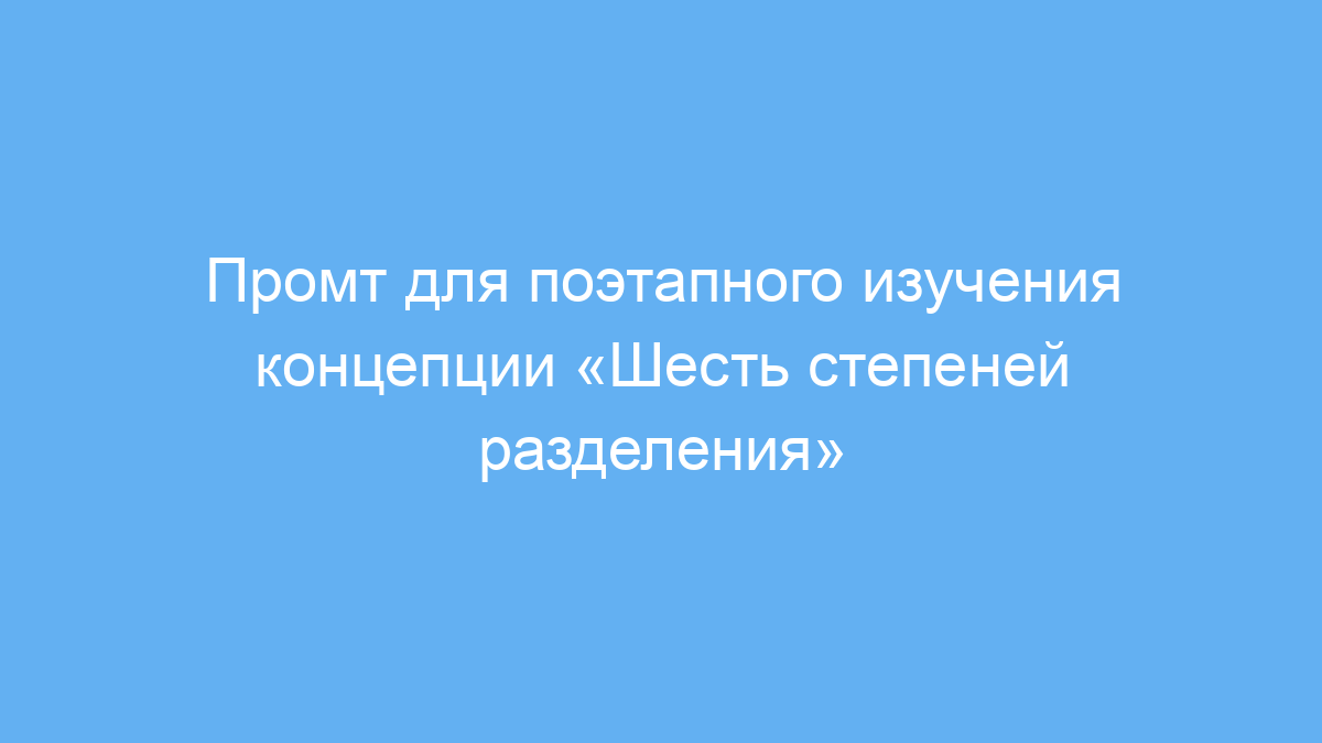 Этот промт предназначен для пользователей, которые хотят лучше понять и исследовать идею «Шесть степеней разделения». Это теория, объясняющая, как все люди на планете связаны через небольшое количество промежуточных знакомств. Применение промта помогает структурировано изучать эту концепцию на примере собственной социальной и профессиональной сети.