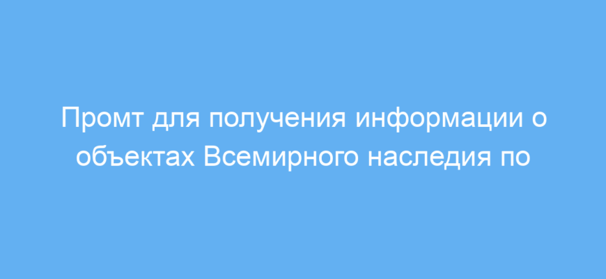Этот промт предназначен для специалистов, преподавателей, студентов и всех, кто интересуется культурным и природным наследием. Он помогает быстро получить структурированную и краткую информацию об объектах Всемирного наследия любого государства или конкретного объекта. Это удобно для учебы, подготовки презентаций, туристического планирования или пополнения знаний.
