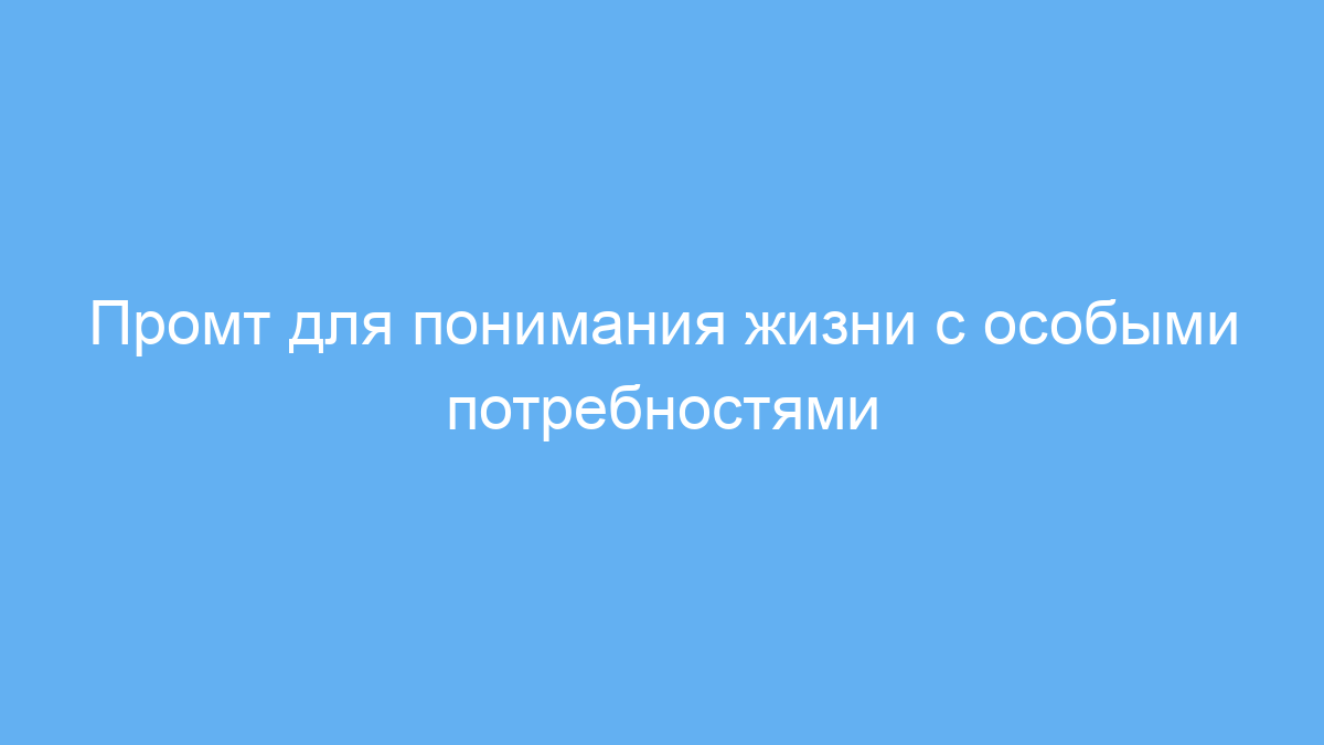 Этот промт предназначен для людей, которые хотят лучше понять, как живут люди с разными видами инвалидности. Он поможет тем, кто изучает инклюзию, работает в социальной сфере, образовании или просто проявляет интерес к проблемам людей с особыми потребностями.