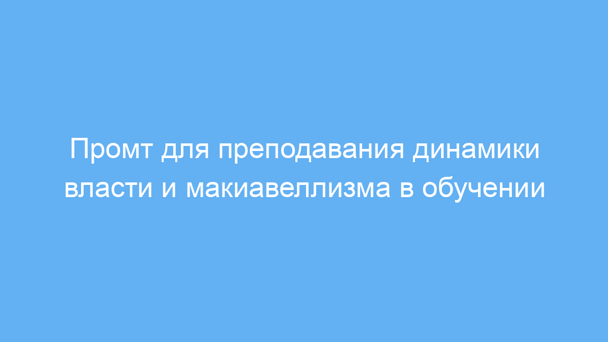 Этот промт специально создан для тех, кто обучается или преподаёт такие сложные и важные темы, как динамика власти и макиавеллизм. Он помогает систематизировать процесс обучения, облегчая понимание даже сложных концепций благодаря структуре от простого к сложному и чётким вопросам. Промт станет полезен студентам, преподавателям и всем, кто интересуется политической философией и психологией управления.