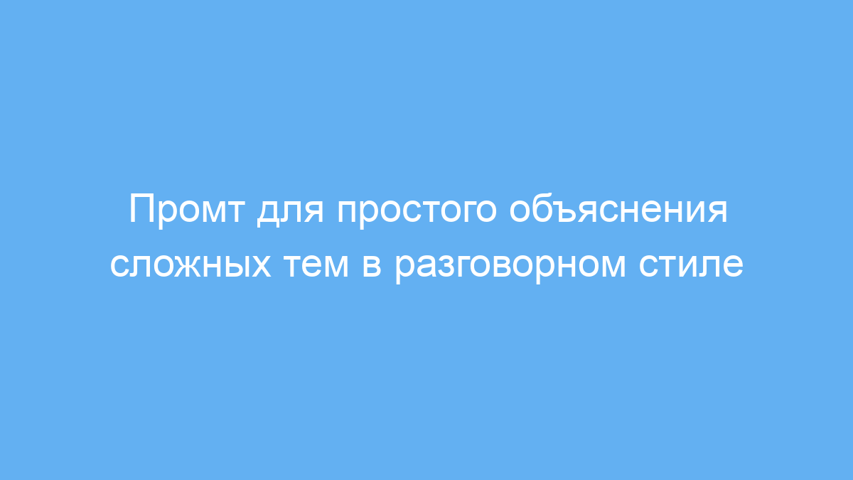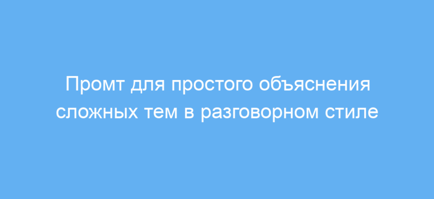 Промт решает проблему непонятного языка и помогает объяснять даже сложные вещи «на пальцах». Он нацелен на максимальное упрощение материала с использованием дружеского и ненавязчивого разговорного стиля. Благодаря ему ответы будут понятны даже тем, кто впервые сталкивается с данной темой.