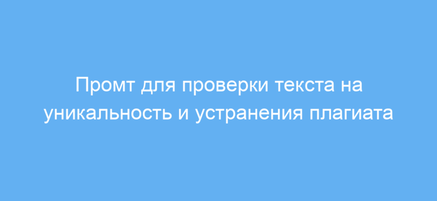 Этот промт создан для тех, кто хочет быстро получить уникальный текст, исключающий плагиат. Он полезен авторам, студентам, копирайтерам и всем, кто работает с текстами и хочет убедиться, что их материал оригинален. Промт помогает избавиться от заимствований, что повышает качество контента и снижает риски санкций за плагиат.