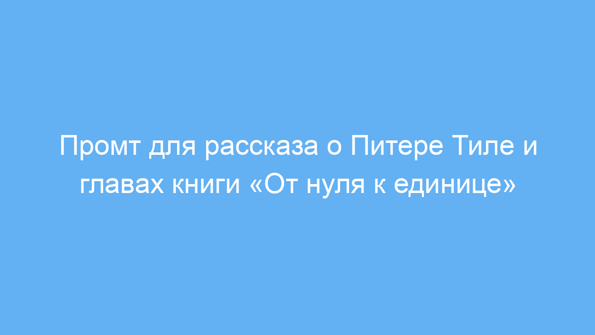 Этот промт предназначен для тех, кто хочет быстро получить структурированную информацию о бизнесмене и инвесторе Питере Тиле, а также ознакомиться с содержанием его книги «От нуля к единице». Он поможет сэкономить время на поиске и систематизации данных для учебы, работы, создания контента или исследования. Используя промт, вы легко получите краткое и понятное описание личности и перечень глав без необходимости читать всю книгу.