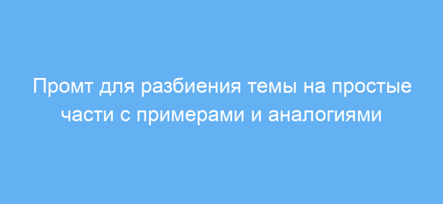 Промт просит нейросеть разделить указанную тему на небольшие блоки, используя простые слова, аналогии и примеры из жизни. Это позволяет превратить сложные концепции в понятные истории, которые легче понять и объяснить другим.