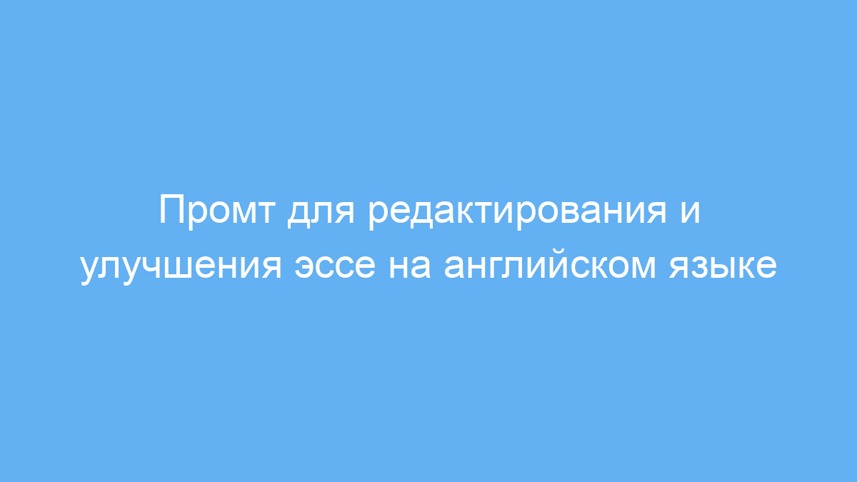 Этот промт предназначен для студентов и всех, кто пишет эссе на английском языке и хочет улучшить качество своих текстов. Он помогает выявить и исправить грамматические, орфографические и пунктуационные ошибки, а также улучшить структуру и логику изложения. Использование промта облегчает процесс редактирования, помогает понять ошибки и способствует обучению.