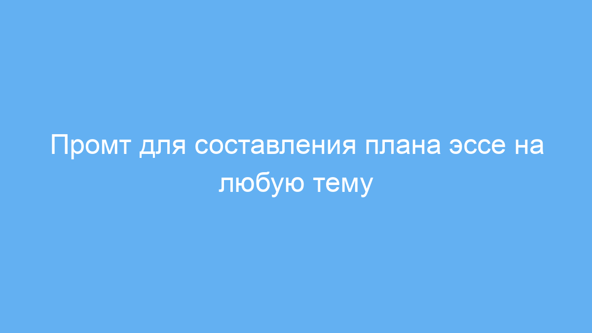 Этот промт создан для тех, кто пишет эссе и хочет быстро получить четкий и логичный план. Он помогает структурировать свои мысли и идеи, разбивая эссе на вводную часть, основные абзацы и заключение. Промт будет полезен студентам, преподавателям, копирайтерам и всем, кто сталкивается с задачей написания грамотного текста.