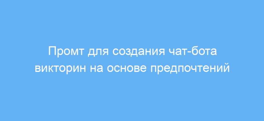 Этот промт подойдет разработчикам, преподавателям и энтузиастам, которые хотят быстро создать интерактивного чат-бота для проведения викторин. Он помогает автоматически генерировать вопросы, учитывая заданные пользователем жанр, уровень сложности и тип вопросов. Такой бот облегчает создание обучающих или развлекательных викторин без необходимости вручную придумывать вопросы и ответы.