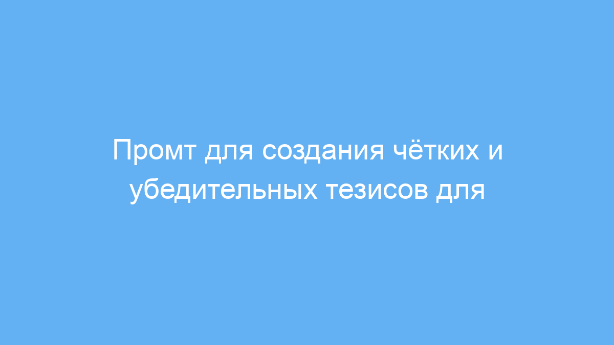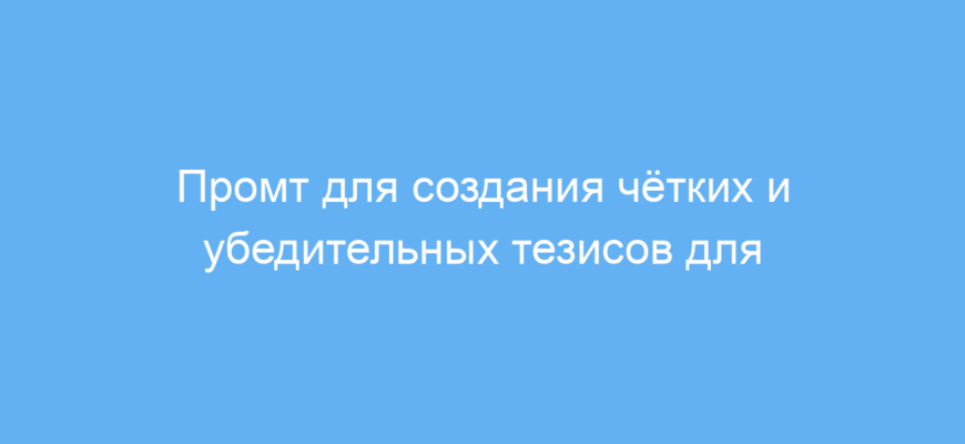 Этот промт предназначен для студентов, исследователей и всех, кто готовит научные или учебные работы. Он помогает быстро создавать лаконичные, понятные и спорные тезисы, которые являются основой для построения аргументированного исследования.