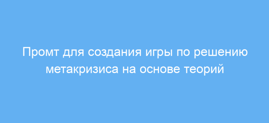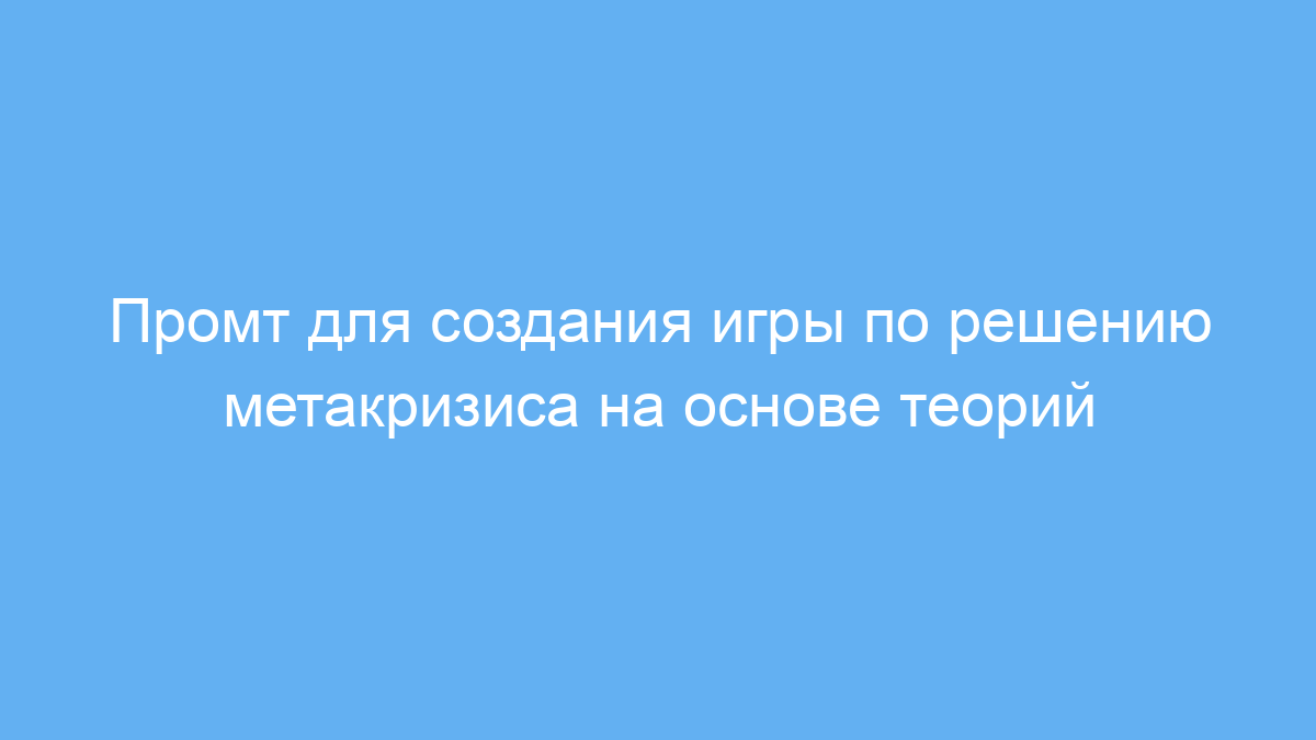 Промт решает задачу разработки игры, которая позволяет учащимся понять сложные взаимосвязанные проблемы современного «метакризиса» — экологическую устойчивость, социальную справедливость, психическое здоровье, развитие сообществ и образование. Он помогает сформировать правила, игровое поле и сценарии, которые отражают сложные влияния между этими факторами, делая игру одновременно познавательной и увлекательной.