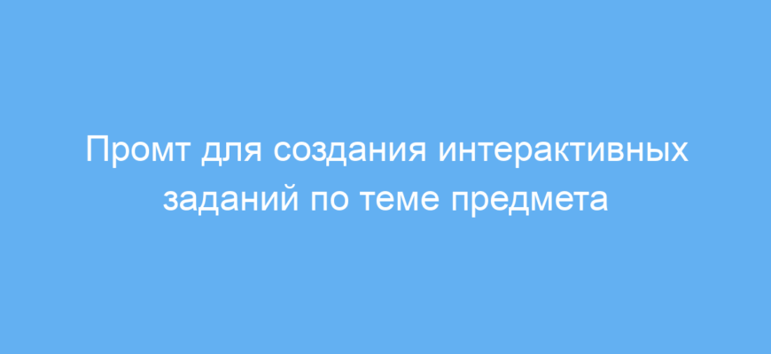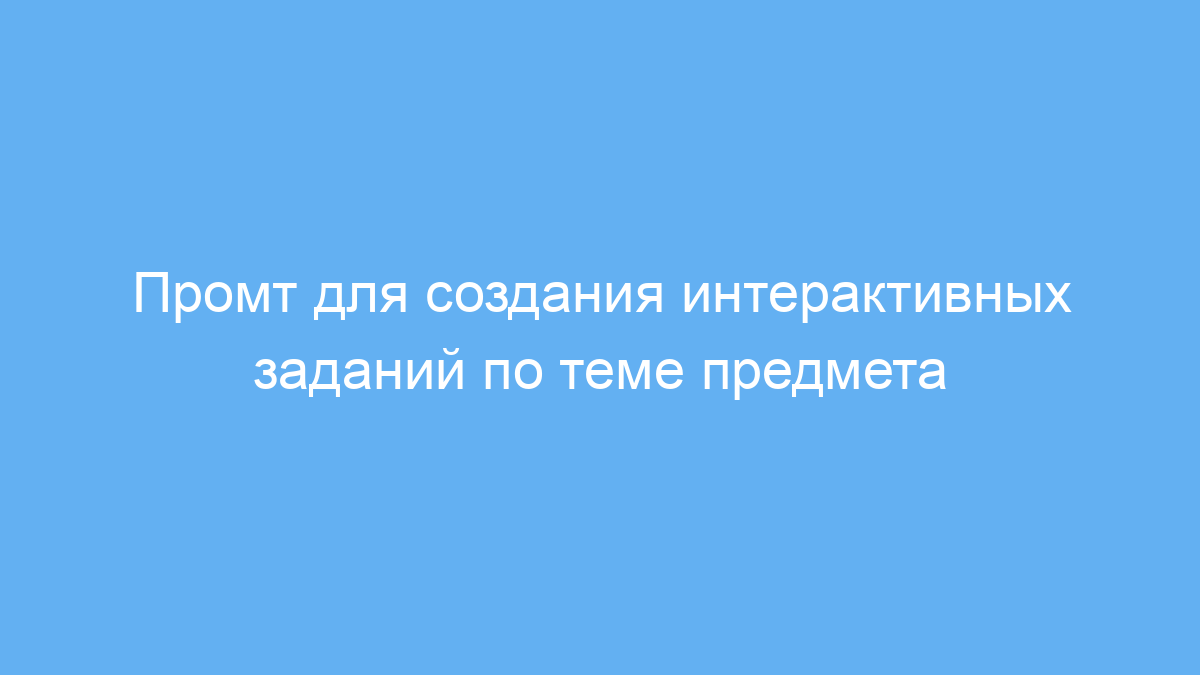 Промт генерирует список из пяти интерактивных заданий, основанных на указанных вами параметрах: предмет и тема. Это может быть любая учебная дисциплина и тема, что делает его универсальным помощником для создания обучающих материалов.