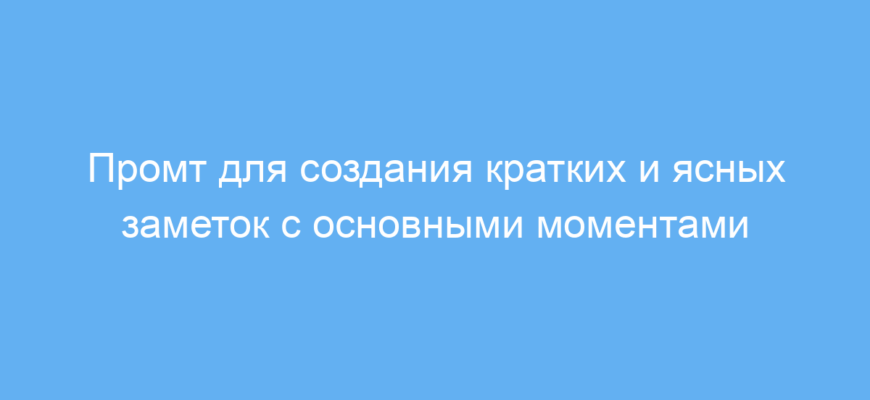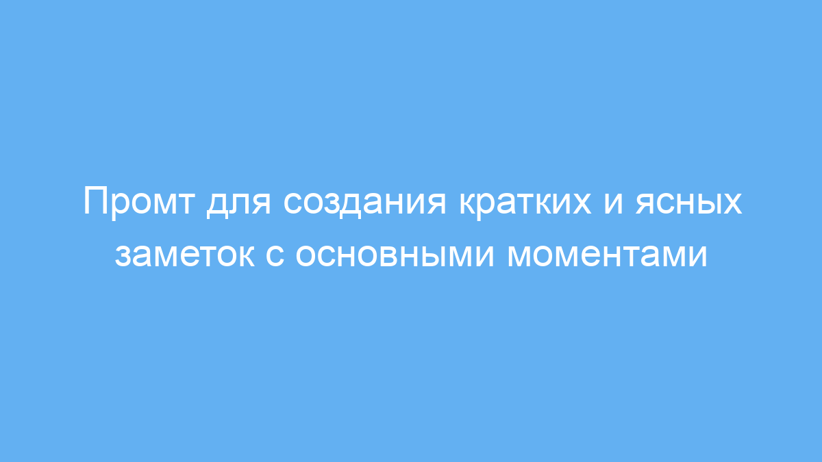 Данный промт помогает решать проблемы излишней информации и потери времени на долгие чтения. Он преобразует текст в короткие, чёткие и структурированные заметки, которые легко воспринимать и использовать дальше.