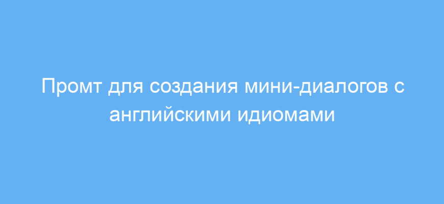 Этот промт будет полезен для преподавателей английского языка, студентов и всех, кто хочет лучше понять и использовать английские идиомы в разговоре. С его помощью можно быстро получить простые и наглядные мини-диалоги между персонажами с выделенными идиомами. Это помогает быстрее запомнить выражения и увидеть их в контексте живой речи.