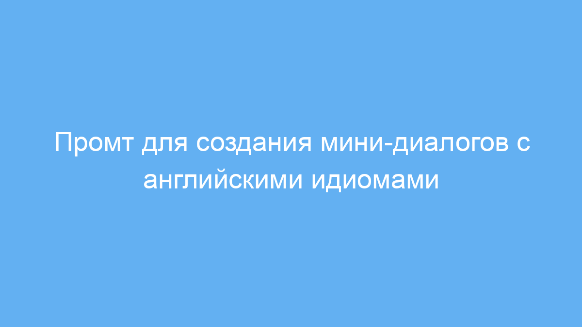 Промт создает короткие диалоги с персонажами Алиса и Боб, которые используют английские идиомы, выделенные специальными кавычками «<<>>». Также в ответе приводятся примеры того, как применять эти выражения, и вопросы для обсуждения, чтобы углубить понимание. Пользователь указывает, сколько таких диалогов нужно сгенерировать — это помогает получить нужный объем материала.