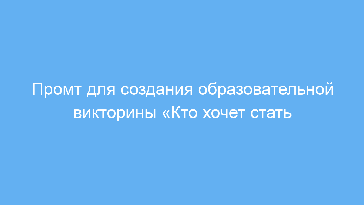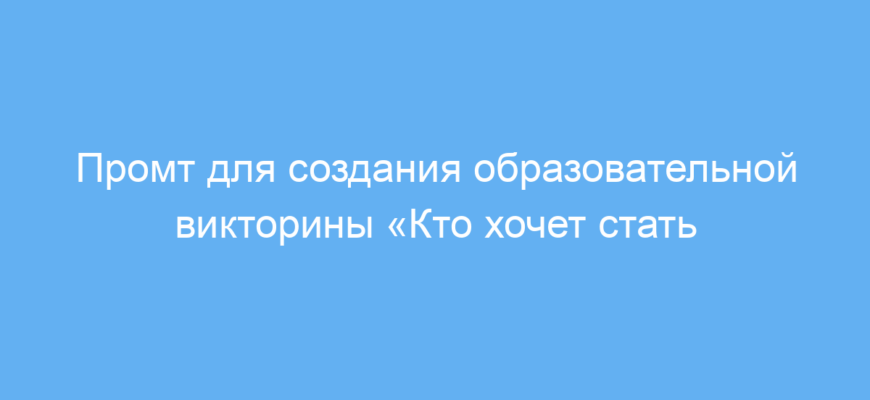 Этот промт предназначен для тех, кто хочет быстро создать обучающую викторину в формате популярной игры «Кто хочет стать миллионером». Он отлично подходит педагогам, тренерам, создателям развивающего контента и всем, кто обучает или развлекает аудиторию с помощью интерактивных заданий.