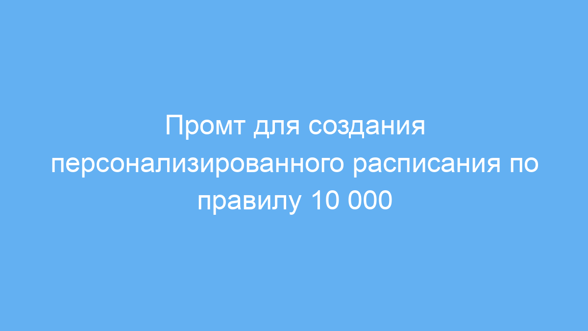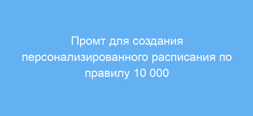 Этот промт создан для профессионалов и тех, кто хочет эффективно планировать своё время, чтобы добиваться мастерства в своей сфере. Он помогает организовать ежедневное расписание, основываясь на знаменитом правиле 10 000 часов, согласно которому для достижения высокого уровня экспертизы нужно потратить около 10 000 часов целенаправленных практик.