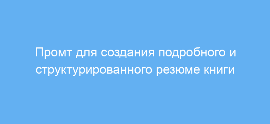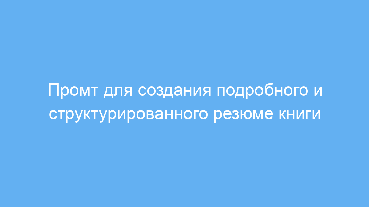 Этот промт предназначен для тех, кто хочет получить четкое и полное резюме книги — будь то студенты, преподаватели, блогеры, журналисты или просто любители литературы. Он помогает быстро получить всю ключевую информацию о книге: сюжет, персонажей, темы, стиль, важные сцены и критический приём автора. Такой подход облегчает подготовку докладов, обзоров или тематических исследований без необходимости читать всю книгу целиком.
