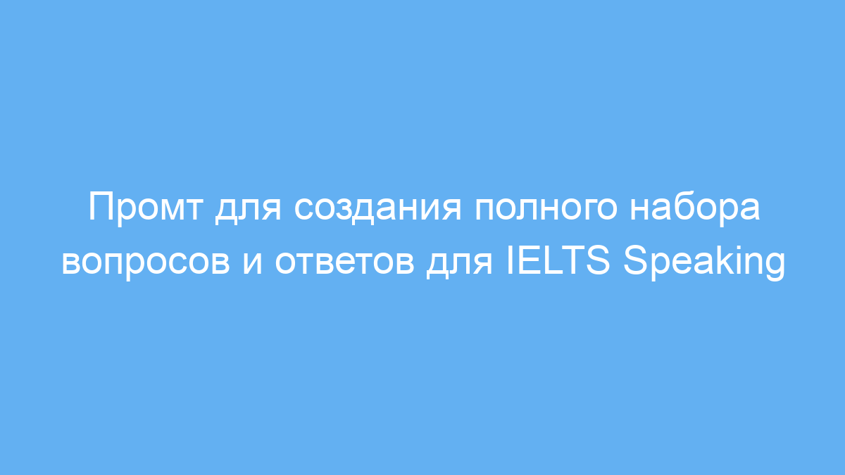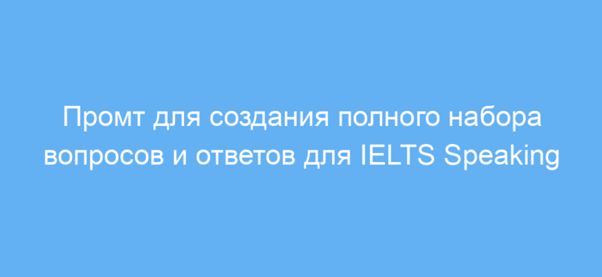 Этот промт значительно упрощает процесс подготовки к экзамену IELTS Speaking, предлагая структурированный и разнообразный набор вопросов и ответов под любую тему. Вы экономите время на генерацию и при этом получаете качественный материал, который поможет тренировать навыки разговора и улучшить уверенность на экзамене.