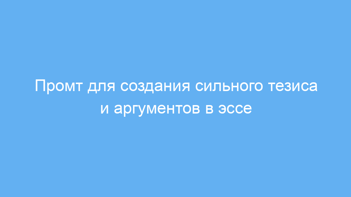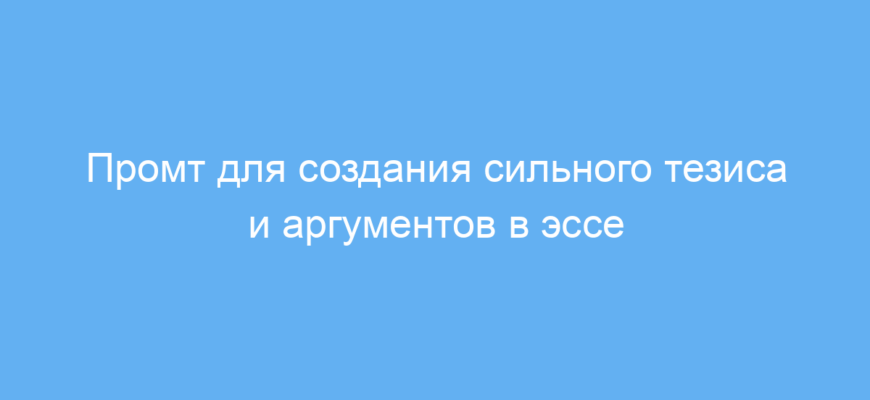 Этот промт облегчает задачу формулировки сильного тезиса и поддержки его аргументами, экономит время и улучшает структуру вашего текста. Он особенно полезен для тех, кто хочет начать написание эссе с чёткой главной идеи и обоснованными доказательствами.