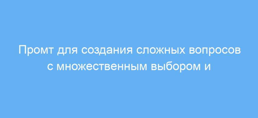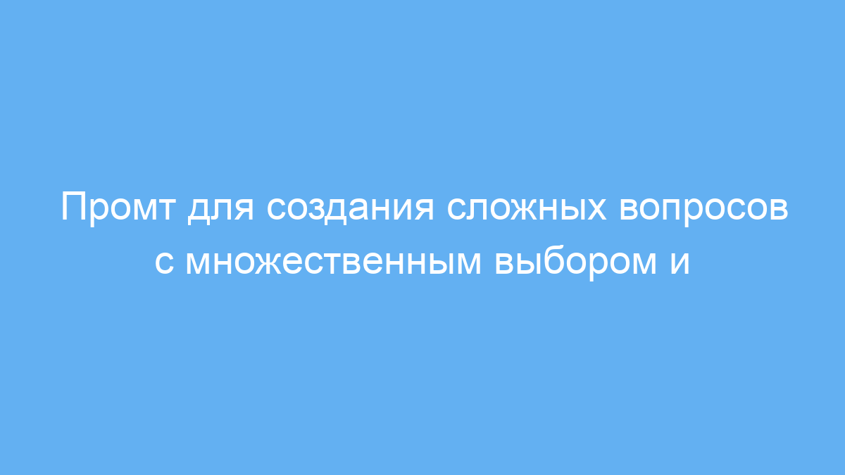 Данный промт помогает быстро и эффективно создавать сложные вопросы с множественным выбором, которые стимулируют глубокий анализ и критическое мышление учеников или сотрудников. Он формирует не только тесты, но и сопутствующие учебные материалы, облегчая подготовку и проведение занятий на высоком научном уровне.