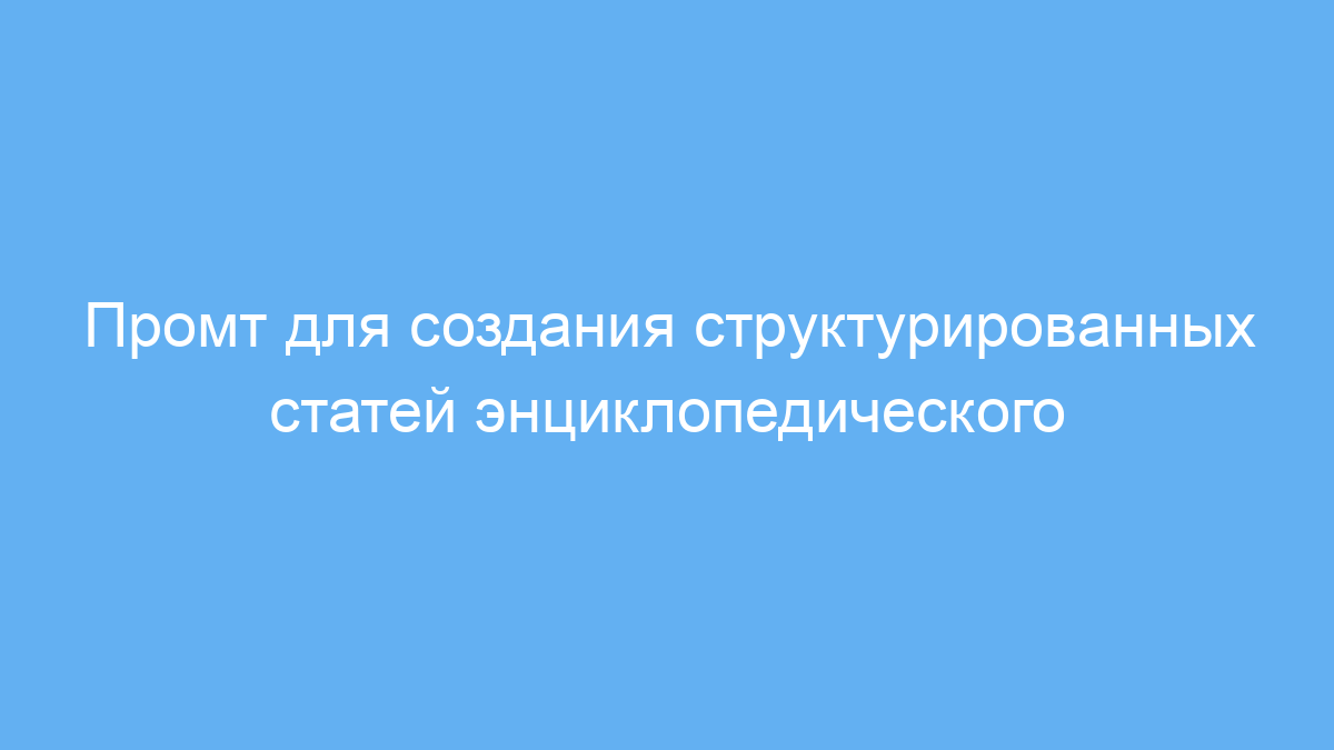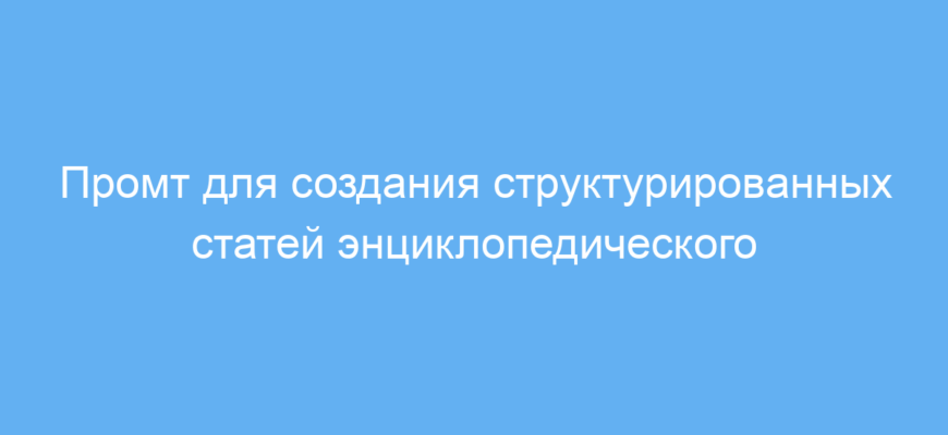 Этот промт предназначен для тех, кто хочет быстро и качественно создавать развернутые статьи в стиле энциклопедии с четкой структурой. Он идеально подойдет копирайтерам, студентам, блогерам и специалистам, работающим с нейросетями для генерации контента. Основная задача промта — упростить процесс написания информативных, логически построенных текстов, которые с первого взгляда понятны читателям и отвечают требованиям SEO.