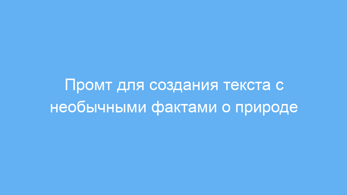 Использование этого промта позволяет быстро получить короткий и интересный текст с необычными фактами о природе. Это экономит время на поиск и помогает создавать привлекательный контент для любых задач от соцсетей до учебы.