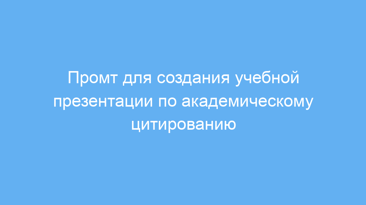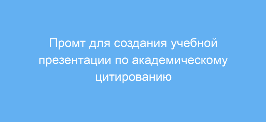 Используйте промт для ускоренной подготовки обучающих презентаций по академическому цитированию. Перед запуском убедитесь, что выбрали правильный язык и страну, чтобы информация была максимально релевантна аудитории.