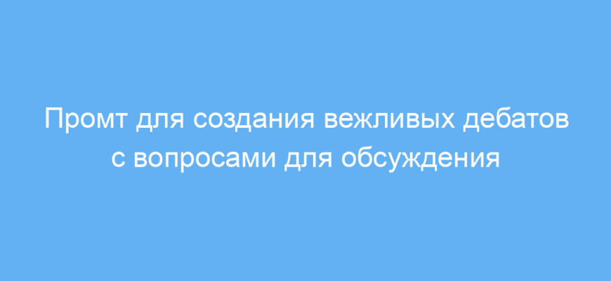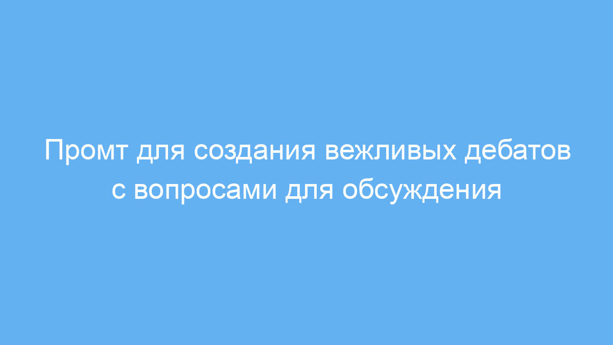 Использование данного промта позволяет быстро получить структурированный, вежливый дебат с противоположными взглядами на любую тему. Кроме того, он формирует тематические вопросы для дальнейшего обсуждения, что удобно в обучении и подготовке материалов. Благодаря простоте и универсальности промта его легко адаптировать под разные задачи — от учебы до создания контента.