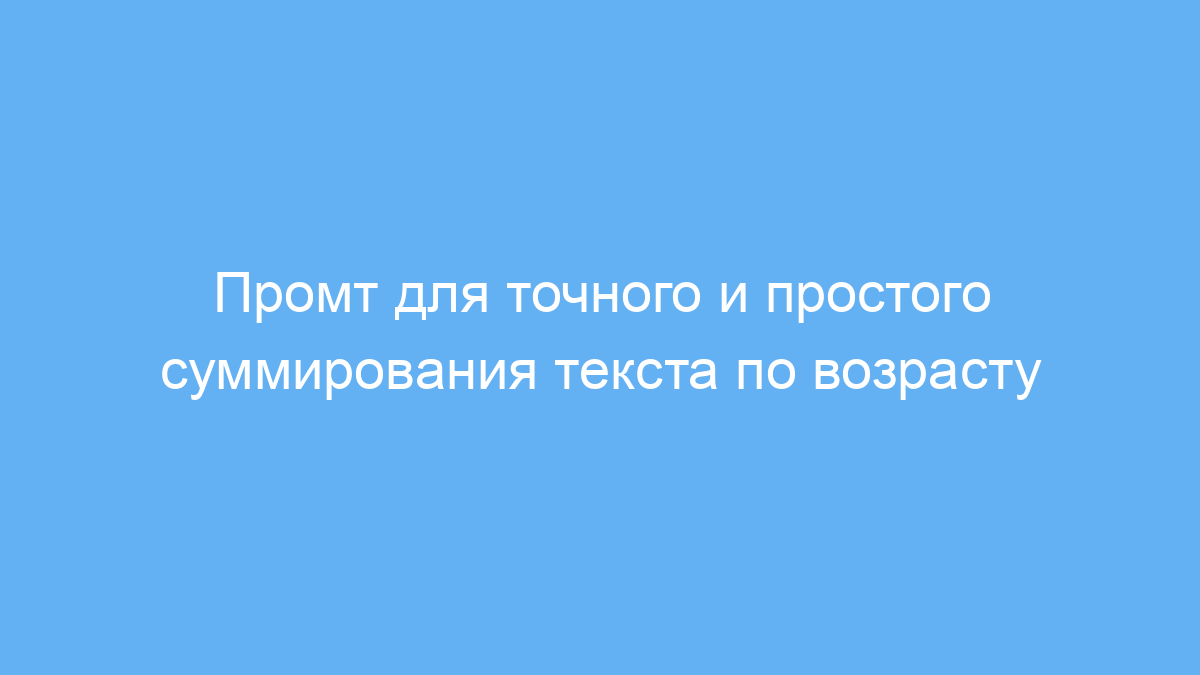Этот промт предназначен для всех, кто хочет быстро и точно получить краткое содержание больших текстов с сохранением ключевых деталей. Он особенно полезен для студентов, преподавателей, редакторов и просто любознательных людей, которые хотят понимать сложные материалы проще. Промт помогает адаптировать объяснение под возраст и уровень восприятия пользователя: от ребенка до взрослого, используя понятные им слова и термины.