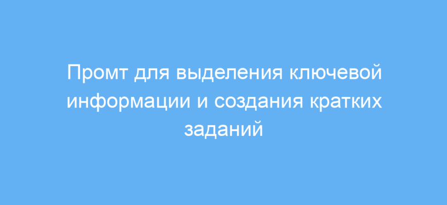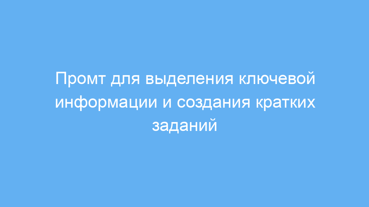 Использование этого промта позволяет быстро и качественно выделять главное из текста и создавать точные краткие задания. Это помогает экономить время, избегать недопониманий и повышать эффективность работы с информацией.