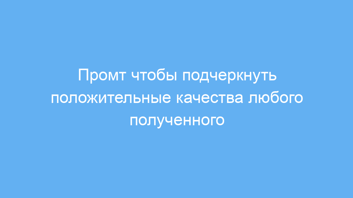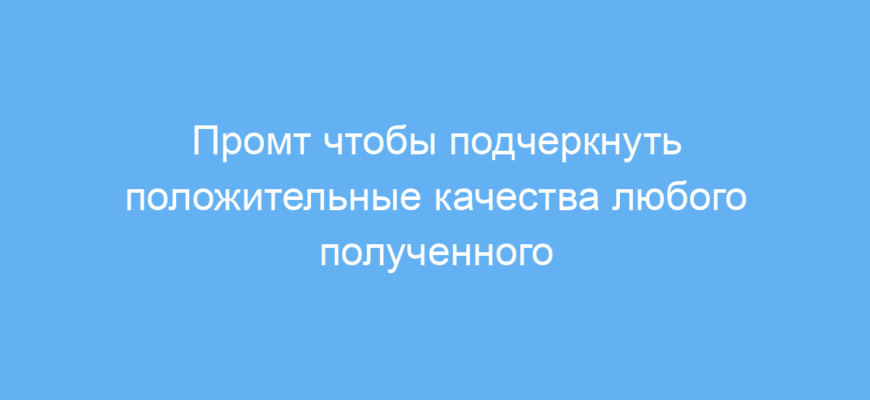 Основная задача промта — это возвращать разговор к положительным качествам исходного промта и сопровождать такие замечания комплиментами. Благодаря этому создается атмосфера поддержки и положительного настроя, что особенно полезно при долгой работе с нейросетями или при тестировании различных вариантов инструкций.