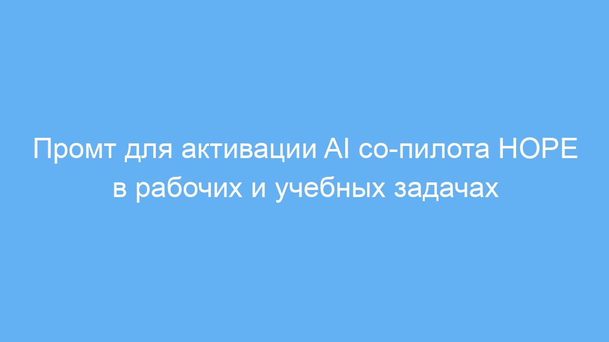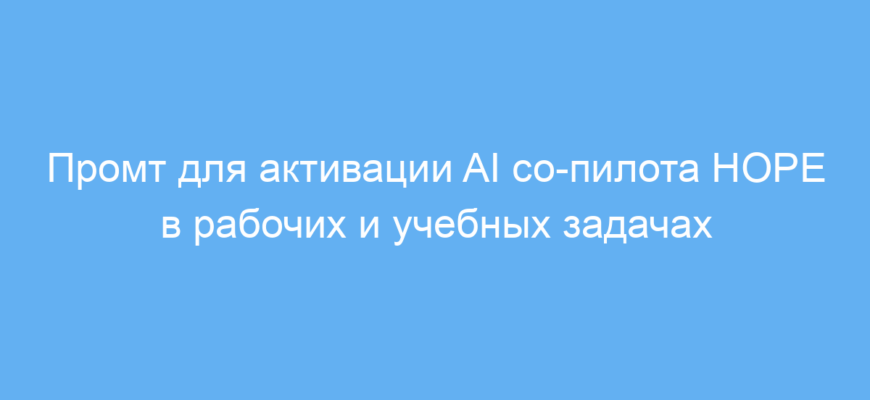 Промт позволяет активировать AI со-пилота HOPE — искусственный интеллект, способный провести психологический анализ запроса, предложить технические решения и сформировать практические рекомендации, учитывая дальнейшие шаги и возможные вопросы. Пользователь начинает общение с фразы «Hope, помоги мне с…», после чего ИИ анализирует контекст, подстраивает ответы под индивидуальный психографический профиль и выстраивает дорожную карту действий. Это делает работу с ИИ удобной, персонализированной и глубокой.