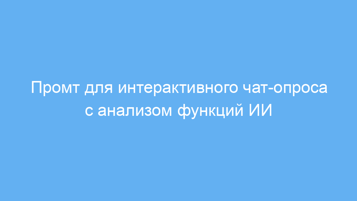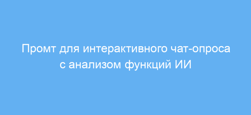 Этот промт позволяет легко создать удобный и вовлекающий чат-опрос, который не только собирает данные о предпочтениях пользователей в области искусственного интеллекта, но и информирует их о преимуществах и рисках. Это экономит время на подготовку материалов, повышает качество взаимодействия и помогает проводить глубокие консультации или обучающие сессии.