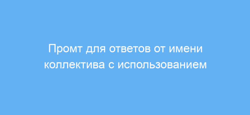 Использование этого промта позволяет легко создавать тексты и ответы от имени группы, что важно для бизнеса, образования и любых коллективных коммуникаций. Это экономит время и формирует единый стиль без необходимости тщательно контролировать каждую формулировку. В итоге вы получаете более убедительные и слаженные сообщения.