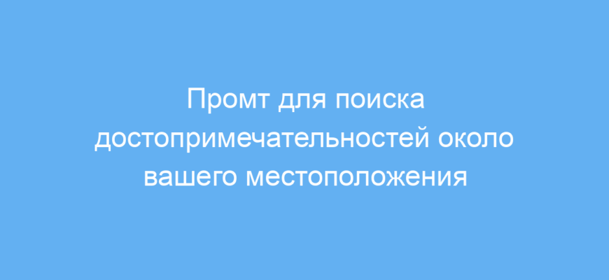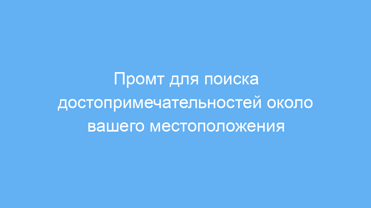 Промт помогает решить проблему долгого поиска информации в интернете или не всегда актуальных рекомендаций. Его можно использовать для планирования маршрута, изучения окружающей среды или просто для того, чтобы узнать, что интересного находится поблизости. Всё, что требуется — указать своё местоположение и, опционально, желаемый тип объектов (например, музеи, парки, кафе).