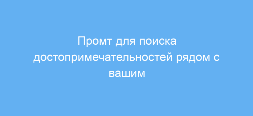 Этот промт предназначен для туристов и путешественников, которые хотят быстро найти интересные места рядом с текущим положением. Он также полезен для тех, кто использует нейросети для создания рекомендаций в сфере туризма, например, владельцев сайтов, блогеров и гидов.