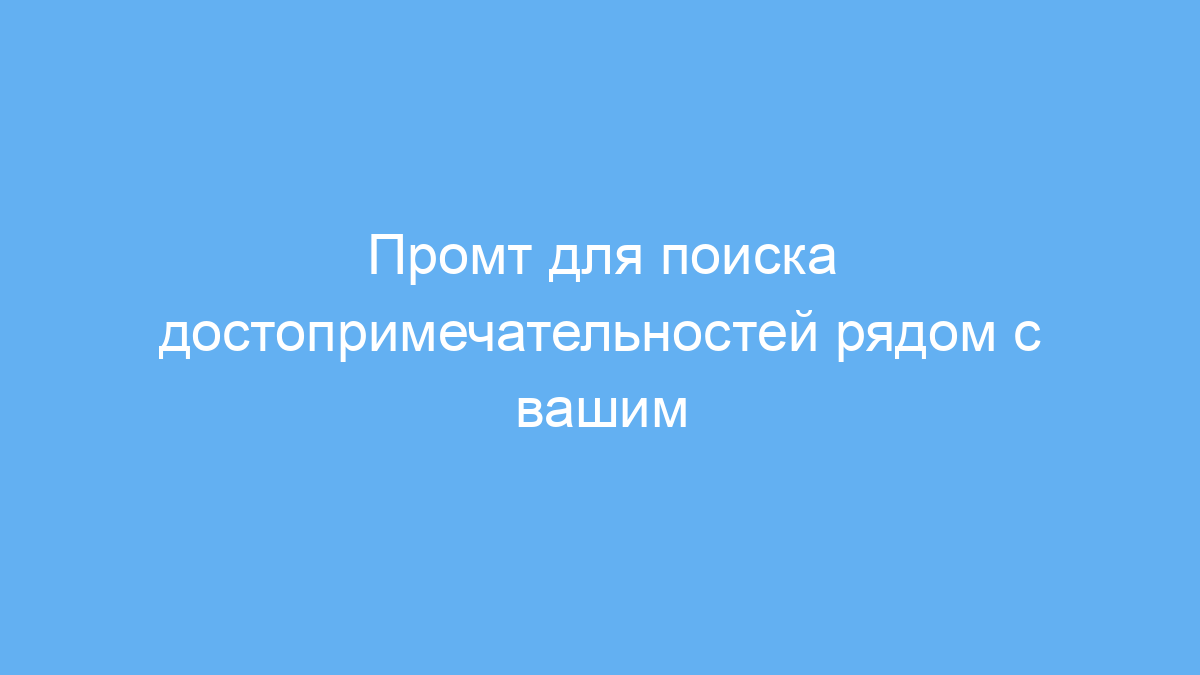 Промт помогает легко узнать, какие объекты или развлечения находятся поблизости — будь то музеи, парки, кафе или исторические памятники. Он экономит время на поиск и даёт персонализированные советы с учётом предпочтений пользователя.
