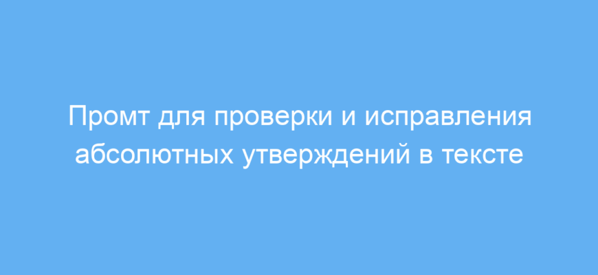 Этот промт предназначен для авторов, редакторов и студентов, которые хотят улучшить свои тексты, сделав их более точными. Он помогает обнаружить и исправить абсолютные утверждения – фразы, которые дают категоричные, часто необоснованные утверждения без оговорок. Такие выражения могут вызывать сомнения у читателя или снижать доверие к тексту.