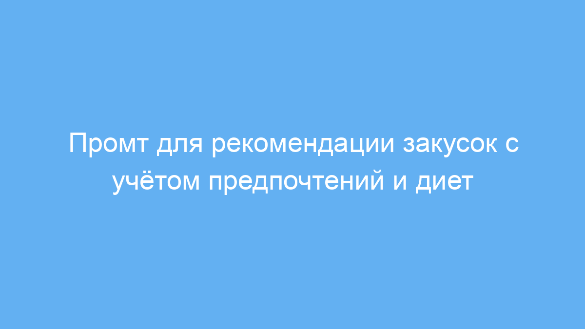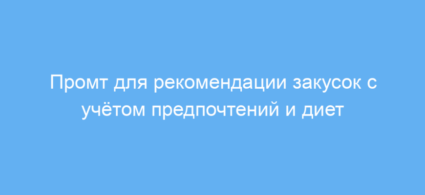 Этот промт экономит время и силы на поиск подходящих закусок, учитывая индивидуальные особенности каждого пользователя. Он структурирован так, чтобы собрать всю необходимую информацию и дать максимально точные рекомендации. Таким образом, пользователь получает полезный и персонализированный совет, а разработчик — удобный инструмент для интеграции в проекты с диалоговым интерфейсом.