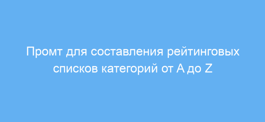 Промт помогает экономить время, задавая чёткую структуру списка с буквенными уровнями от A до Z, где каждый уровень имеет строго по три пункта. Такая организация облегчает восприятие и помогает увидеть не только рейтинговые позиции, но и широту возможных сравнений.