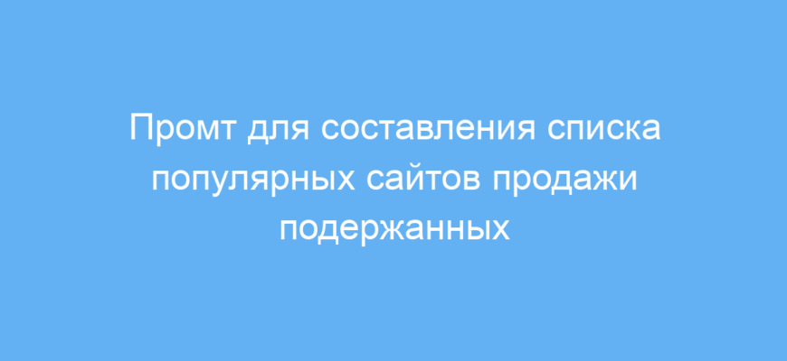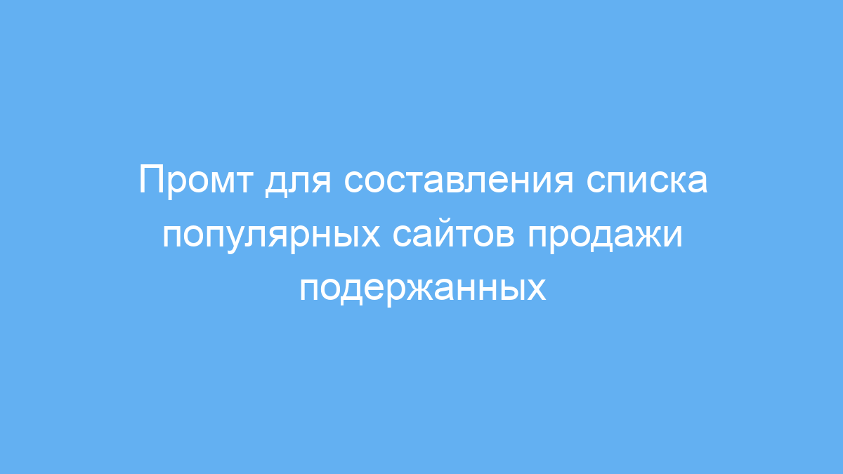 Этот промт предназначен для тех, кто хочет быстро получить список популярных сайтов для продажи подержанных вещей в разных странах. Он помогает сэкономить время на самостоятельный поиск и подобрать проверенные площадки для продажи или покупки б/у товаров.