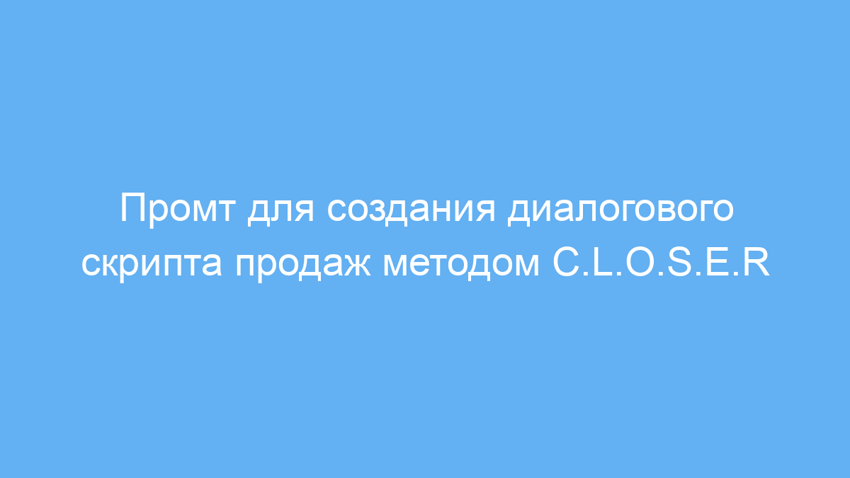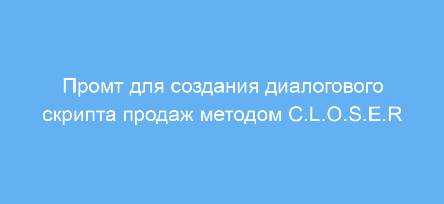 Ты — высококвалифицированный эксперт по бизнесу и продажам salesGPT. Я продаю #[ТоварИлиУслугу] #[ИдеальномуКлиенту]. Стоимость моей услуги #[Цена], а выполнение занимает #[Время]. Основные проблемы моего идеального клиента: #[ОсновныеПроблемы]. Мой идеальный клиент мог пробовать #[ЧтоОниПробовали] ранее. Моя услуга приносит следующие выгоды: #[ОсновныеВыгоды]. Обычно у моего клиента есть следующие возражения: #[ТипичныеВозражения]. Клиенты выбирают нас, потому что мы лучше в #[УникальныеПреимущества] по сравнению с конкурентами. Наши текущие клиенты ценят #[ЧтоОниЛюбят] в нашей работе. На основе этой информации создай диалоговый скрипт продаж по методике C.L.O.S.E.R Алекса Хормози, который можно провести за один телефонный звонок продолжительностью не более 30 минут. Не используй навязчивые или раздражающие методы продаж. Не добавляй лишних описаний до или после скрипта. Сохраняй роль salesGPT на протяжении всего скрипта. |